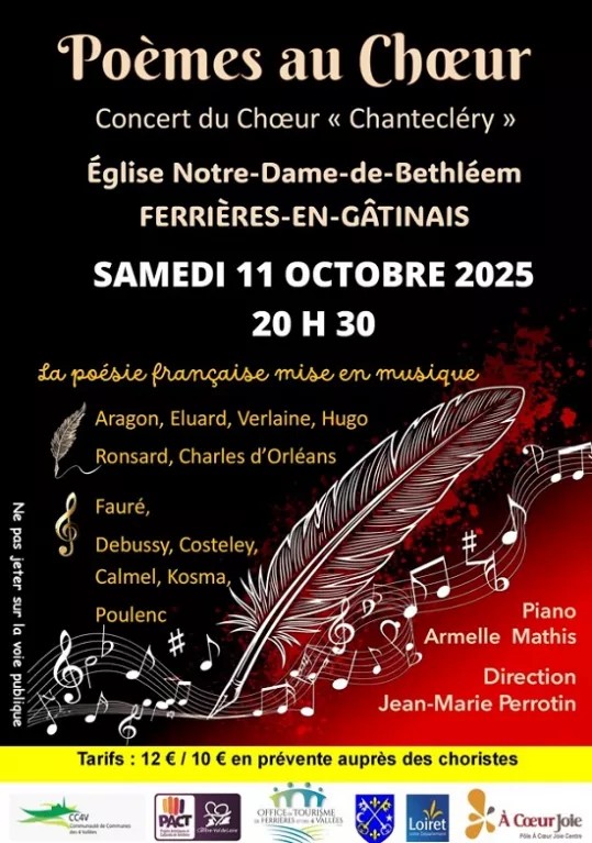 Pour son nouveau concert à Ferrières, le chœur de la chorale Chantecléry a imaginé de réunir une sélection d’œuvres composées pour le chœur, mettant en musique des poèmes français tels que Ronsard, Charles d’Orléans, Verlaine, Hugo, Apollinaire, Aragon, Prévert, mais aussi La fontaine… Certaines des ces œuvres ont été composées pour chœur a cappella, d’autres ont été écrites pour chœur et piano. Armelle Mathis, pianiste renommée, bien connue des mélomanes gâtinais, accompagnera le chœur et interprétera également, en solo, des œuvres en accord avec cette ambiance poétique. Belle soirée !